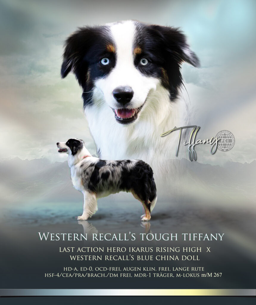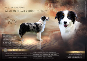 Tiffany ist eine Hündin, die man so schnell nicht vergisst. Neben ihrem Arbeitswillen und ihrer Eleganz sind es vor allem ihre stechend blauen Augen, die sofort jeden in ihren Bann ziehen. Ihr klarer, wacher Blick spiegelt nicht nur ihre Intelligenz wider, sondern verleiht ihr auch eine ganz besondere, fast schon magische Ausstrahlung. Sie ist eine loyale Begleiterin, die mit großer Aufmerksamkeit und einem starken „Will to Please“ überzeugt. Ihr faszinierender Blick geht Hand in Hand mit ihrer schnellen Auffassungsgabe – sie entgeht keinem Signal und ist stets bereit für neue Aufgaben. Sie besticht vor allem durch ihr freundliches Wesen, als auch durch ihre markante Optik.